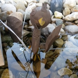 Versteck des Schimmersensors an den Füßen eines Metallvogels (Zuleitungen links im Bild).